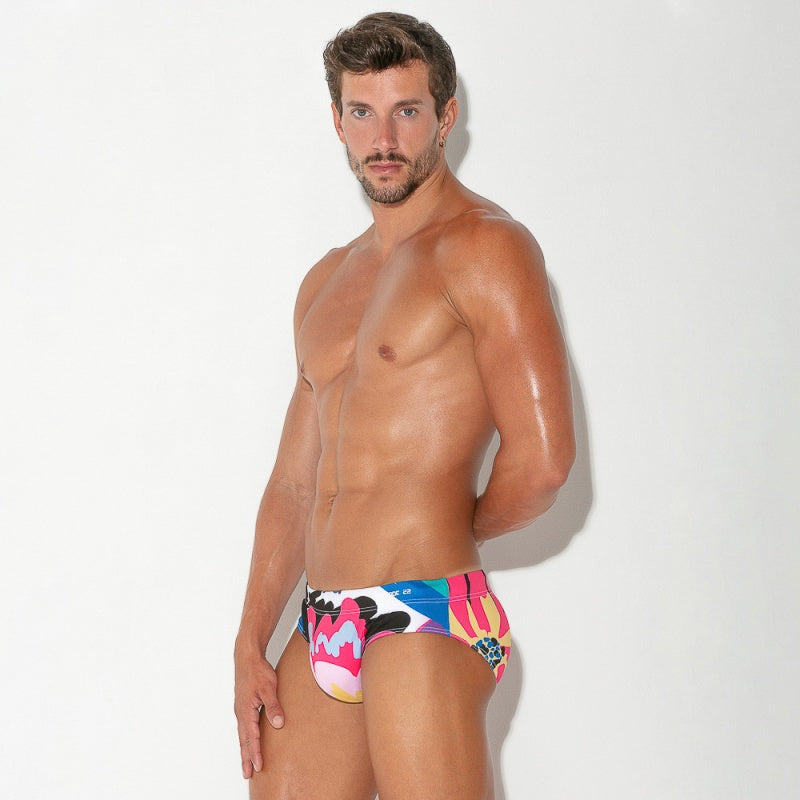 Square cut swim brief made of the finest fabric. Floral print with extra bright colors and our patented Power Shape system to enhance your masculine attributes, high frequency logo on waist, inner cord for extra support.