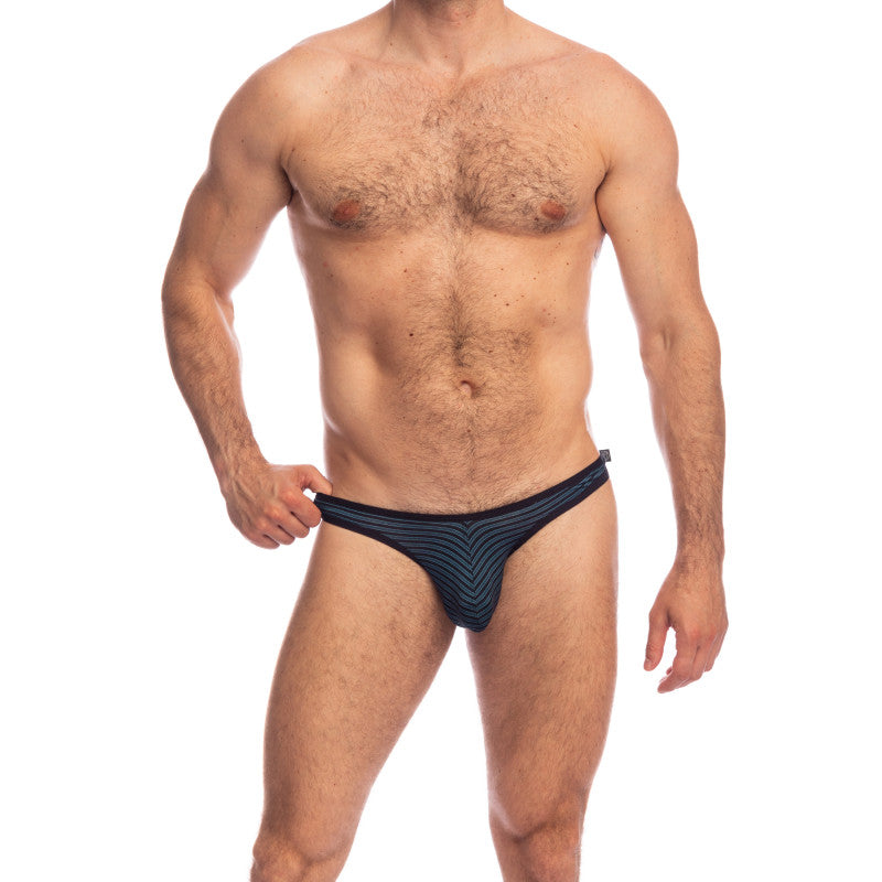 The Blue Glow String Bikini in turquoise blue and black stripes is the perfect accessory for a chic and sexy look, suitable for every season. With its sleek design and bold graphic lines, this men’s string bikini subtly and daringly enhances the male anatomy.