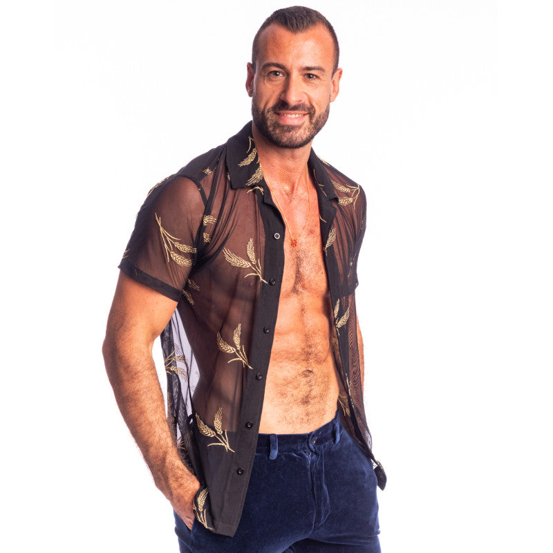 The Épi d’Or Cuban Collar Shirt stands as the centerpiece of the collection, blending couture refinement with sheer sensuality. Made from transparent black tulle embroidered with golden wheat — a tribute to Yves Saint Laurent — each shirt is unique, as the embroidery pattern varies with each cut.