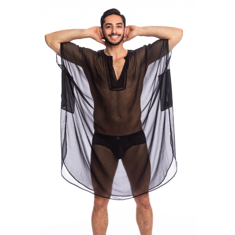 Dive into the world of sensuality and refinement with the transparent caftan for men in fine muslin, adorned with a plastron embellished with fine lace. This flowing, airy garment embodies the perfect alliance between pleasure and elegance, a daring choice for men who wish to express their sensuality with class and refinement.