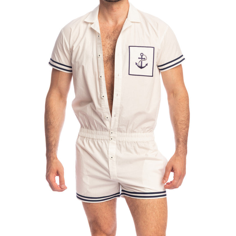 At the front, a sailor flap closure features three navy stripes and marine blue buttons, paying homage to traditional naval uniforms. A tonal anchor embroidery on the chest adds subtle elegance and character.