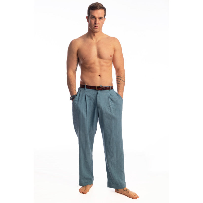 Crafted from airy double cotton gauze, their deep Pacific Blue hue echoes tropical seas, while the pleated front adds volume and elegance to the silhouette. The elasticated waistband at the back ensures a snug yet relaxed fit—perfect for hot days or elevated lounging.