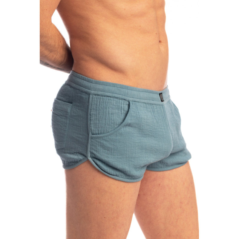Inspired by vintage summer silhouettes, these men's short shorts in double cotton gauze combine absolute comfort and casual seduction . With their rounded edges and short cut, they reveal just the right amount of leg for a confident look, while remaining fluid and lightweight.